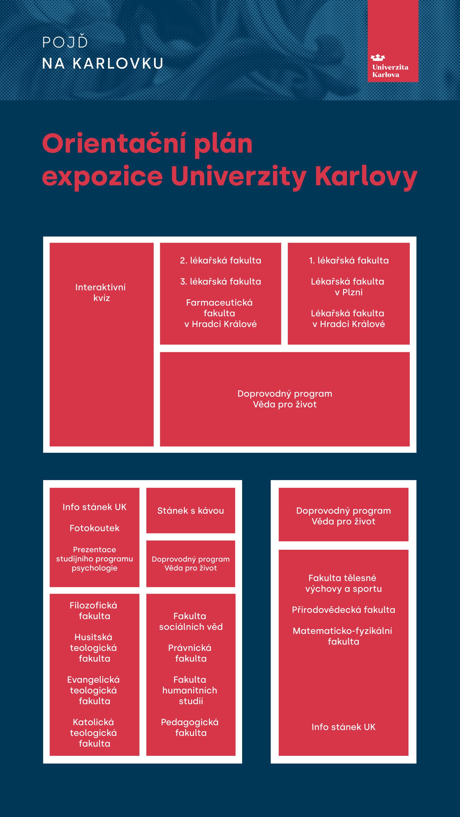 Na expozici najdete všech 17 fakult Univerzity Karlovy a ještě něco k tomu. Najděte svou vysněnou fakultu na plánku a běžte rovnou k ní!